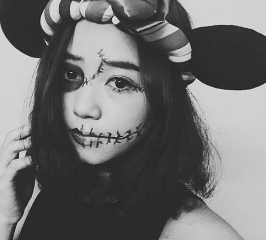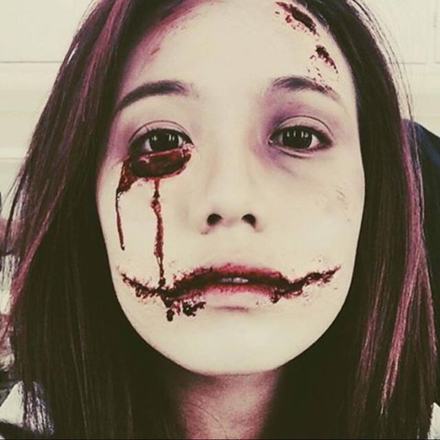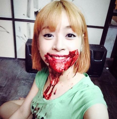 | Vào mùa Halloween năm trước, Mie từng khiến người xem ám ảnh với tạo hình đôi mắt ứa máu, môi rách đến mang tai. |