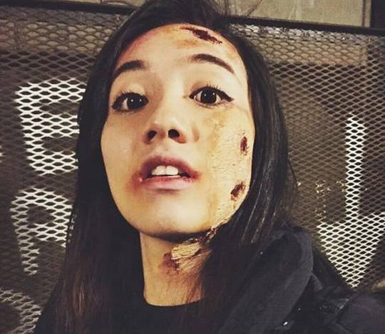 | Mie Nguyễn khiến người xem giật mình bởi gương mặt bầm dập. Cô là một trong những hot girl bắt kịp xu hướng hoá trang kinh dị. |