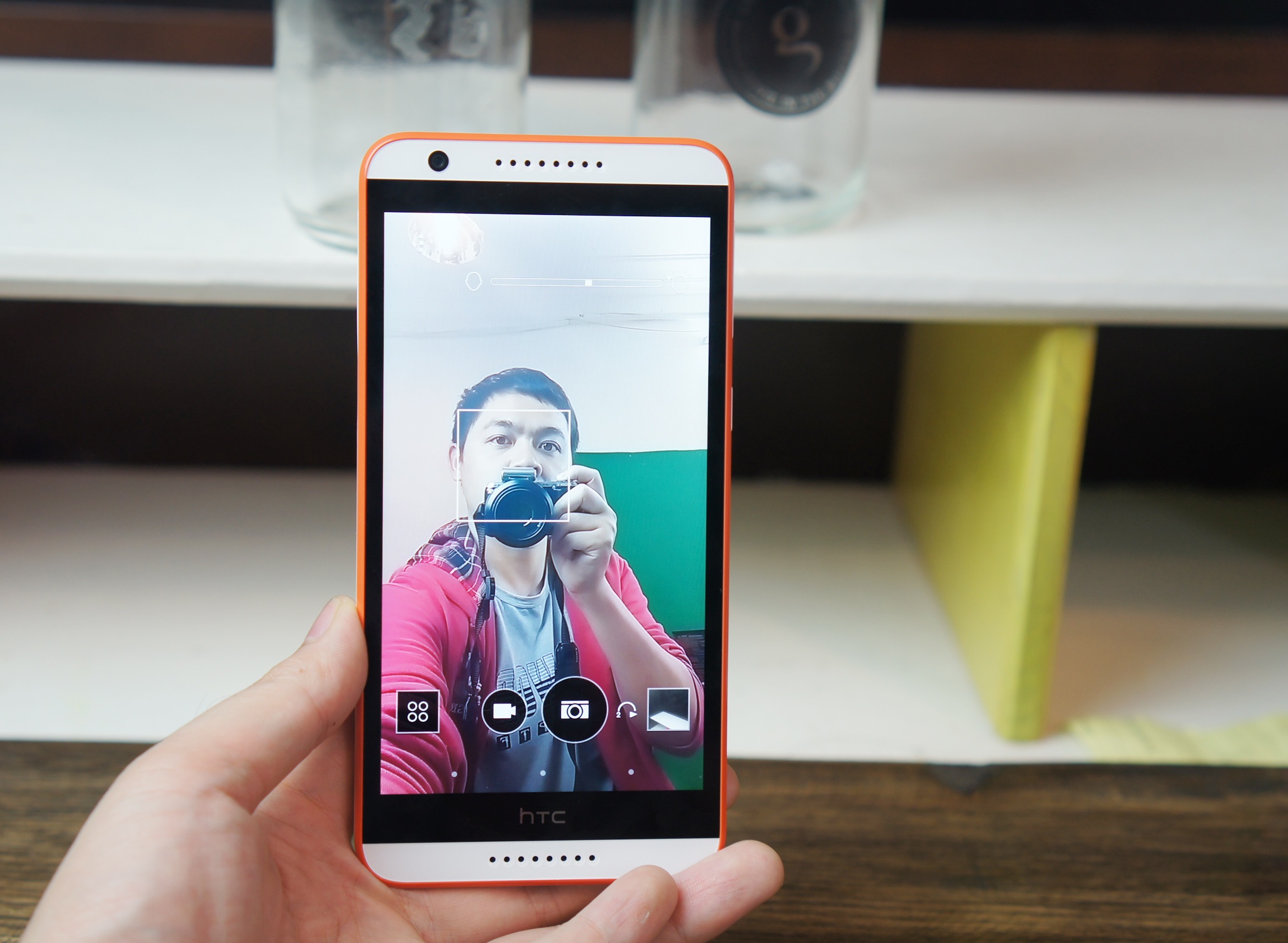 | Camera trước 8 megapixel của máy cho chất lượng ảnh không thua kém các sản phẩm có camera khủng. Người dùng có thể chỉnh độ mịn của gương mặt ngay khi chụp ảnh, thay vì phải xử lý hậu kỳ. Trên thực tế, camera 5 megapixel của các sản phẩm trước đó như One M8, One mini 2 hay HTC Desire 816 đã cho chất lượng ảnh rất ấn tượng. |