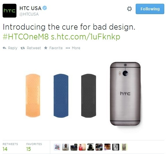 Mới đây, HTC tiếp tục giở chiêu bài cũ ngay trên Twitter chính thức của hãng tại Canada và Mỹ. Bức ảnh vừa đăng tải đã đặt HTC One M8 cạnh 3 mẫu băng cá nhân với màu sắc tương tự Galaxy S5 (vàng, xanh dương và đen) kèm theo các dòng chữ: "có một thứ không giống với những thứ còn lại" và "giới thiệu cách chữa bệnh thiết kế xấu".