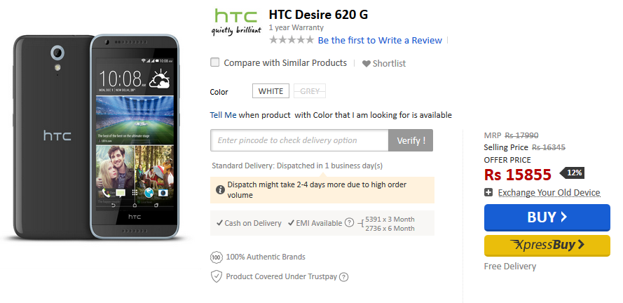 | HTC Desire 620G đồng loạt lên kệ tại các dịch vụ bán lẻ trực tuyến ở Ấn Độ. Ảnh: PhoneArena. |