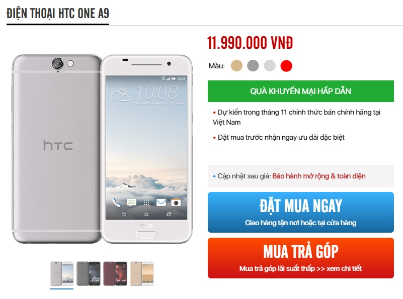 | Giá bán của HTC One A9 niêm yết trên website của một đại lý tại Việt Nam. |