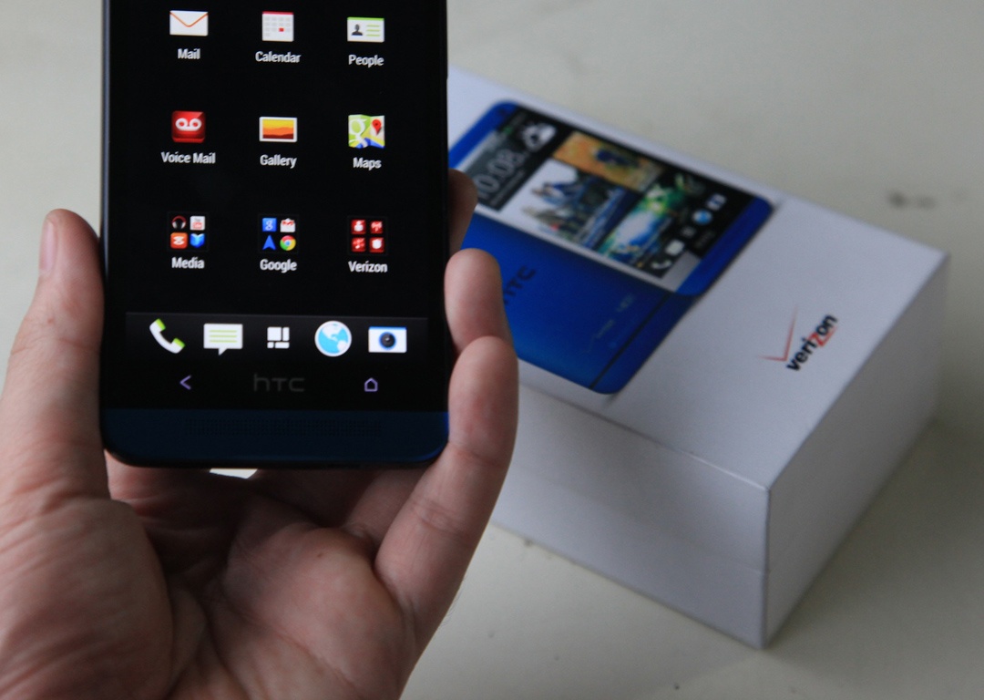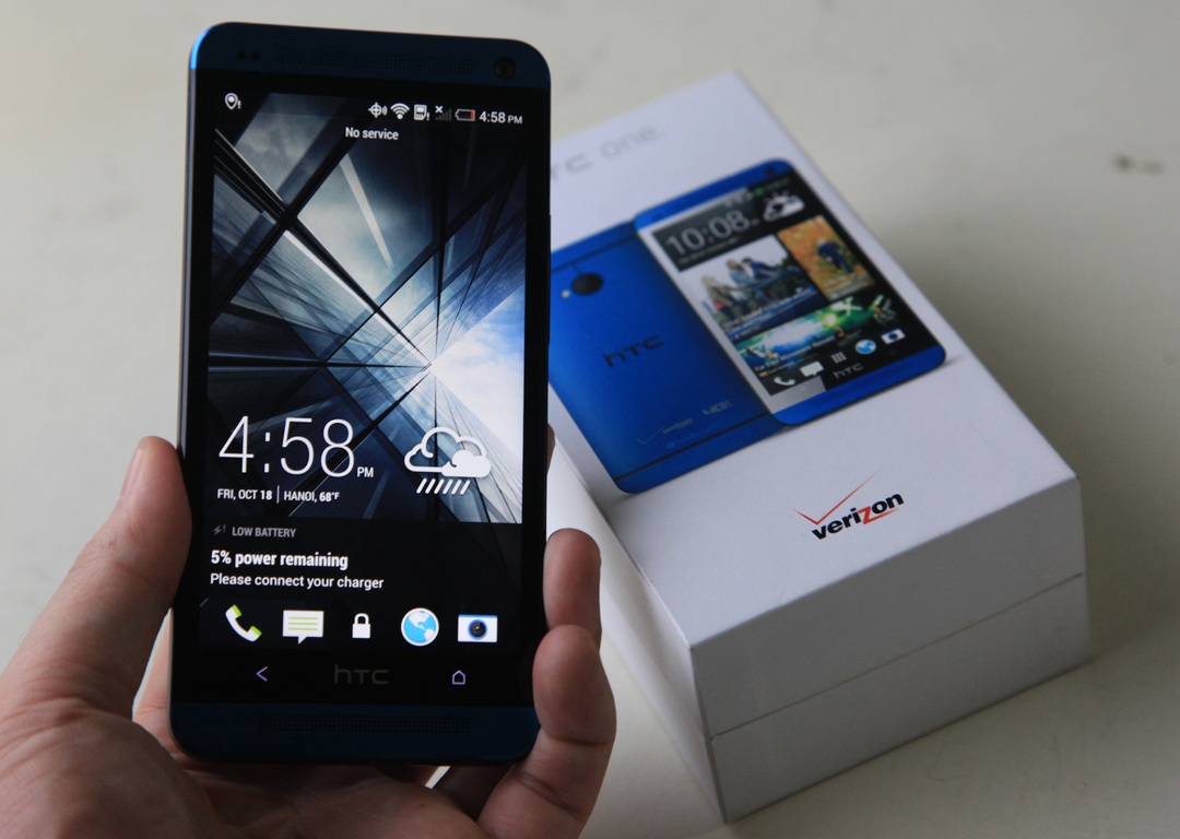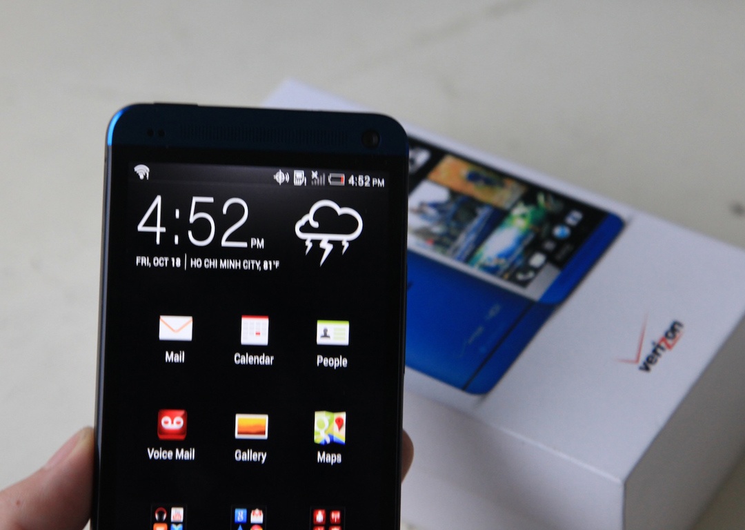 Chiếc One màu xanh dương được tích hợp sẵn hệ điều hành Android 4.2.2 Jelly Bean, giao diện Sense 5.