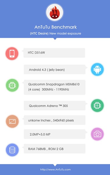 HTC D516W sẽ có màn hình qHD (540 x 960 pixel) chưa rõ kích thước, cùng với camera sau 5MP và camera trước 2MP. AnTuTu còn đưa ra biểu đồ so sánh hiệu năng xử lý của hai thiết bị này. Rõ ràng với chip 8 lõi, D616W được đánh giá cao hơn hẳn D516W.