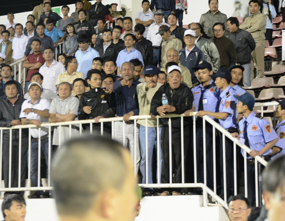 | Rất đông khán giả Pleiku đã nán lại để chửi trọng tài khi họ đi vào đường hầm sau khi trận đấu kết thúc. |