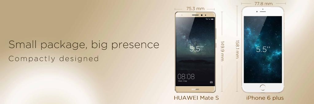 Huawei Mate S cũng có tỷ lệ hiển thị mặt trước lớn nhờ viền màn hình mỏng hỉ 2,6 mm. Màn hình của máy cong nhẹ 2,5D giống iPhone 6 từ Apple.