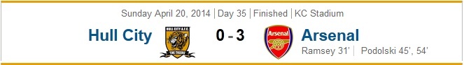 Trên thực tế Arsenal đã đạt được điều họ muốn. Với pha lập công của Ramsey cùng cú đúp của Podolski, Pháo thủ rời sân KC với chiến thắng cách biệt 3-0. Kết quả này qua đó giúp đoàn quân của HLV Wenger củng cố vị trí thứ 4 trên BXH với 70 điểm, hơn kẻ bám đuổi Everton 4 điểm nhưng thi đấu nhiều hơn 1 trận.