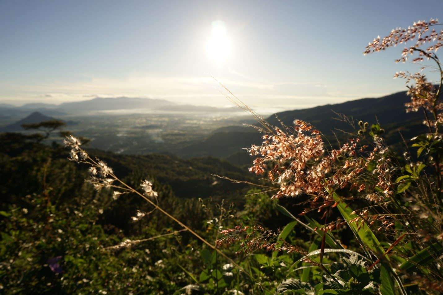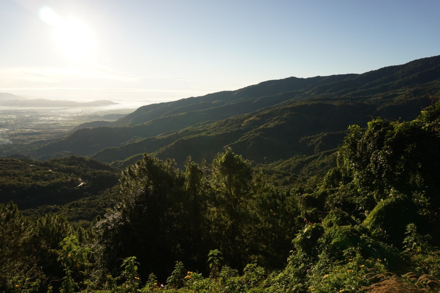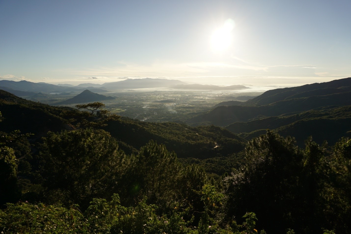 | Và rồi chúng tôi cũng đã tới đỉnh đèo, thu vào tầm mắt khung cảnh tuyệt đẹp. Núi rừng, mây và ánh sáng mặt trời hoà quyện cùng nhau. |
