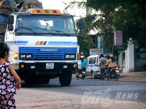 | Tài xế xe đầu kéo BKS 77H - 6907 xuống gặp viên CSGT xuất trình giấy tờ. Sau khi làm việc chưa đầy vài phút thì một CSGT ra dấu hiệu cho đoàn xe lăn bánh. |