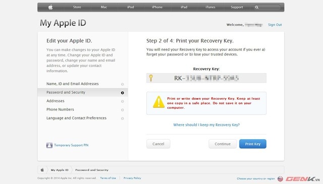 Bước 3: Nhập mã xác thực từ điện thoại; nhận và ghi nhớ Recovery Key; hoàn tất.