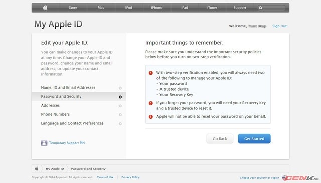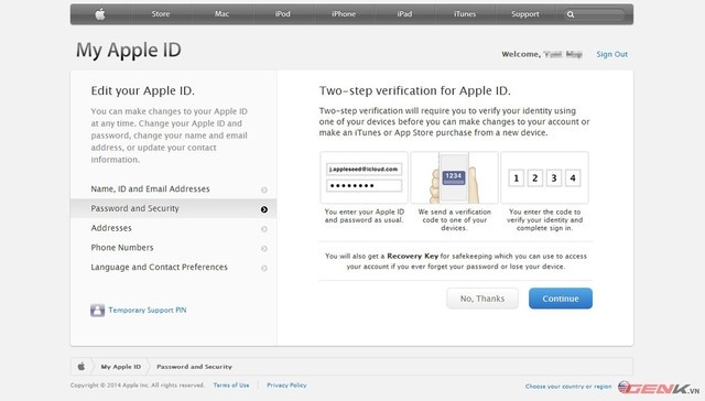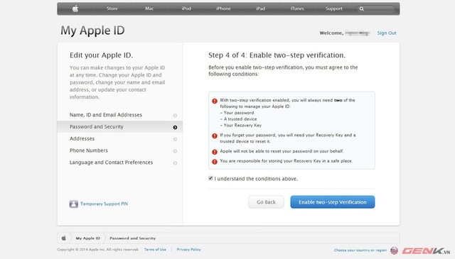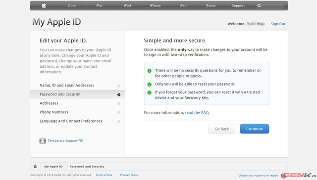 Quay trở lại với tính năng hỗ trợ bảo mật 2 lớp của Apple, để kích hoạt đươc tính năng này, người dùng cần có một số điện thoại và Apple sẽ gửi code về số điện thoại được đặt sẵn mỗi khi người dùng muốn đăng nhập trên một thiết bị mới hoặc thiết bị đã từng đăng nhập nhưng chưa được cho vào danh sách các thiết bị tin tưởng (Trusted Devices), qua đó giúp bạn kiểm soát và bảo vệ tốt hơn cho tài khoản cũng như các thiết bị của mình.