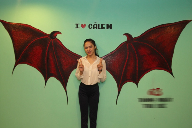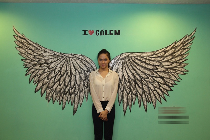 | Hương Giang chụp ảnh với đôi cánh thiên thần - một trong những hình ảnh đặc trưng của quán. |