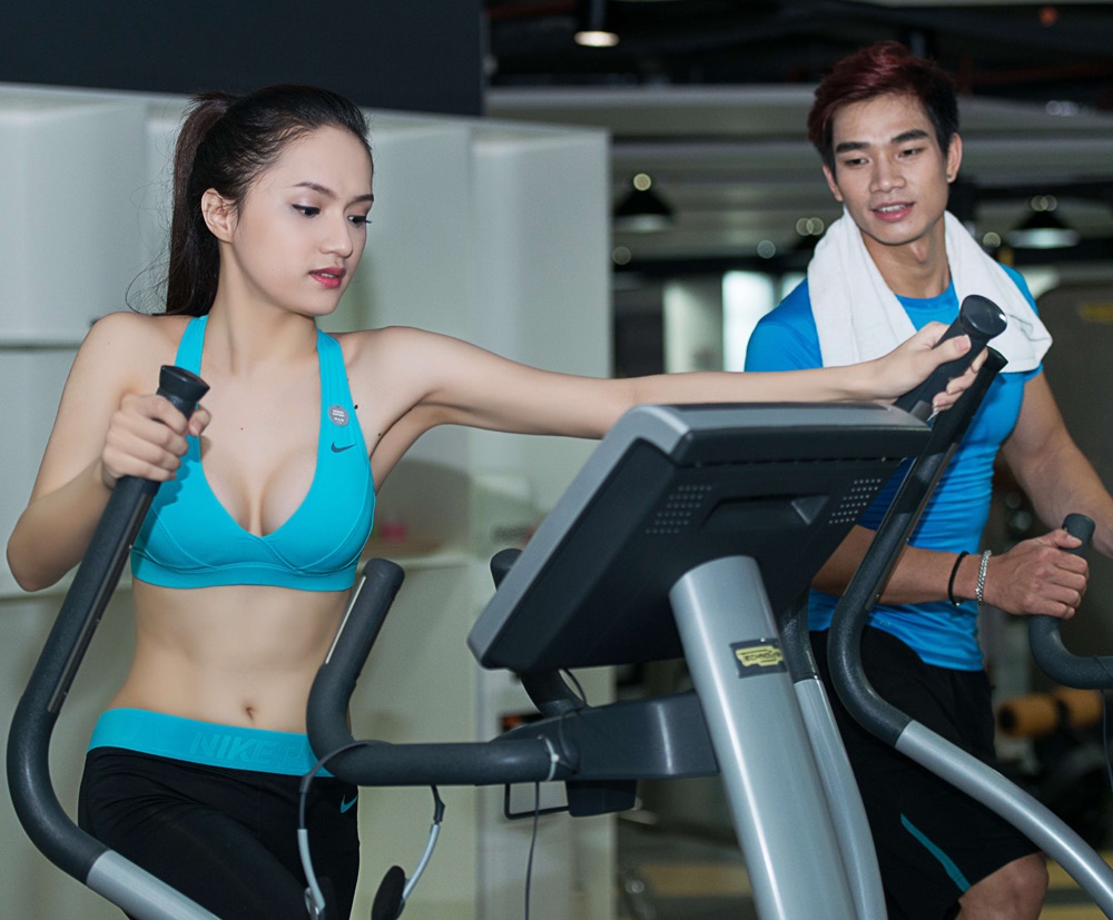 Hương Giang được các chuyên gia thể hình hướng dẫn từng động tác.