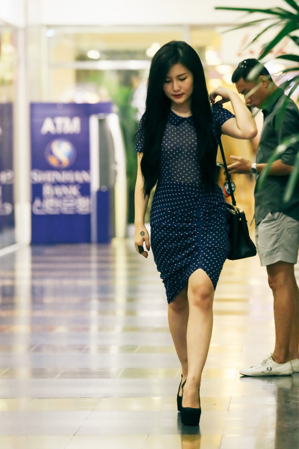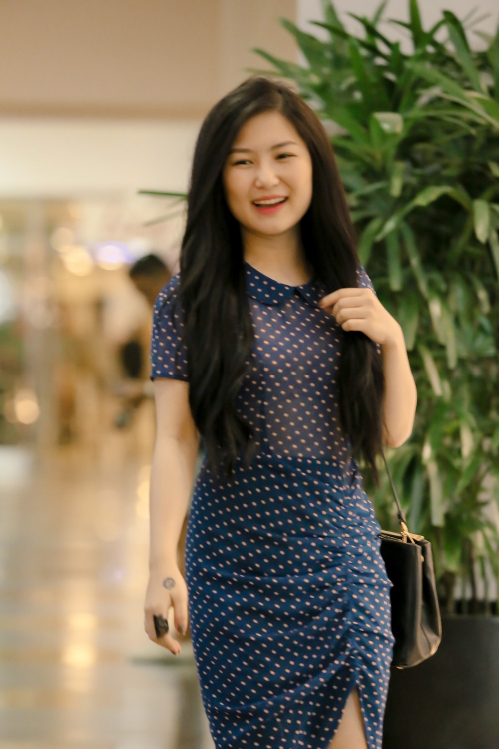 | Quán quân The Voice 2012 diện váy chấm bi xuyên thấu gợi cảm. Khi phát hiện ống kính phóng viên hướng về phía mình, cô ngại ngùng che mặt. So với thời điểm cuối năm ngoái, nữ ca sĩ tăng cân trông thấy. |