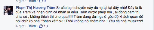 Sau đó, Hương Tràm đã lên tiếng giải thích: "Đây là Facebook của Tràm và nhận định cá nhân là điều Tràm được phép nói, ai đồng cảm thì chia sẻ, không thích thì cho qua! Tràm đang đứng ở góc độ khách quan để nói chứ không phải phán xét".