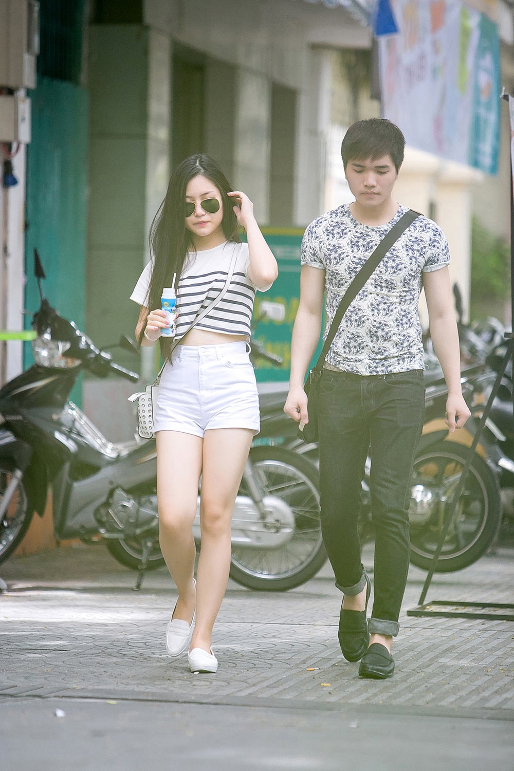 Khác hẳn những bộ cánh gợi cảm và có phần sến sẩm trước đó, chiều nay, Hương Tràm mặc phong cách trẻ trung, năng động và phù hợp với tuổi 19 của cô. Nữ ca sĩ tự lái xế hộp đi làm.