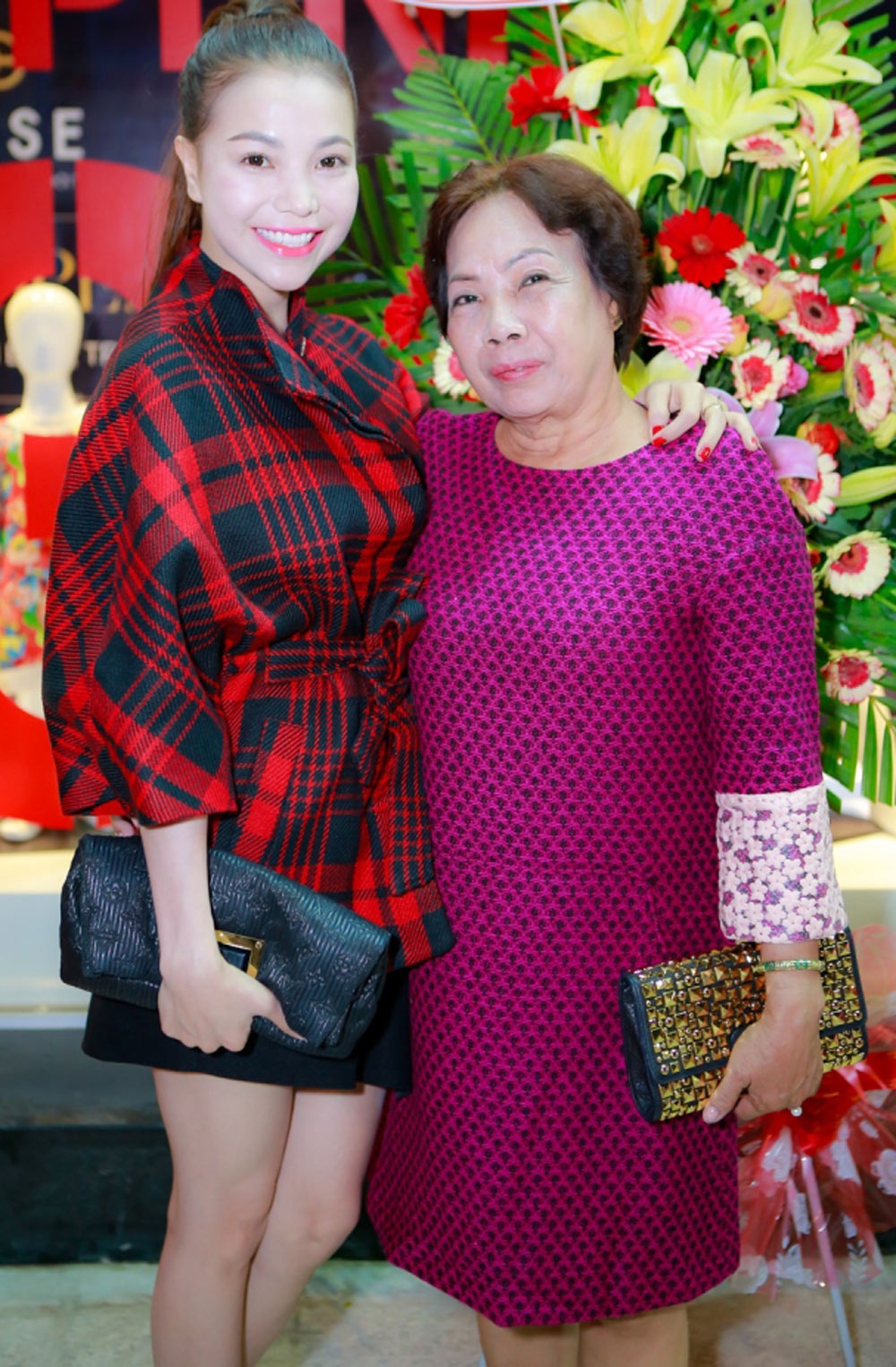 | Trà Ngọc Hằng đi dự khai trương cùng mẹ. Gần đây, nhờ chịu đầu tư trang phục nên phong cách thời trang của cô được khen tinh tế, sang trọng. |