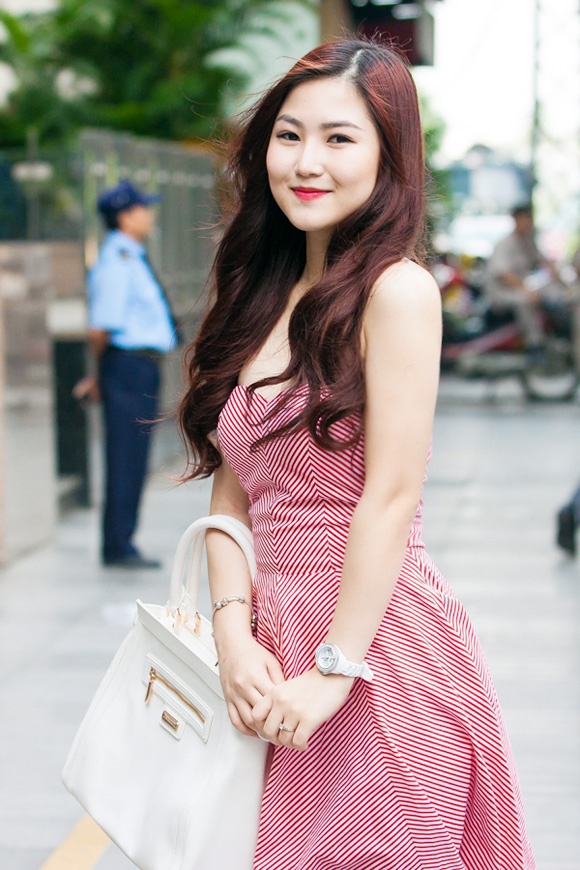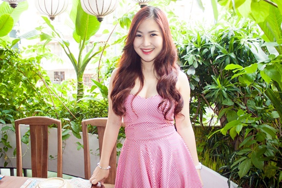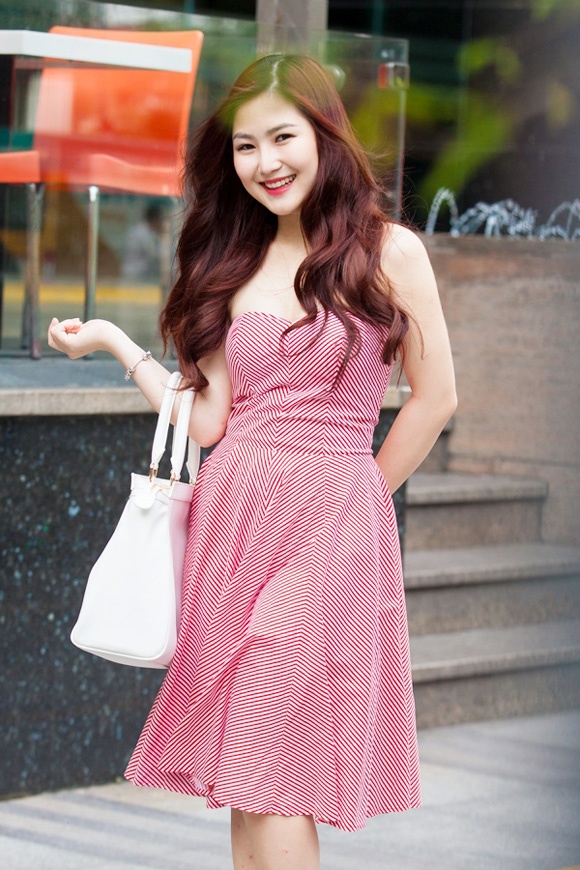 | Hương Tràm rạng rỡ với chiếc đầm hồng kẻ. |