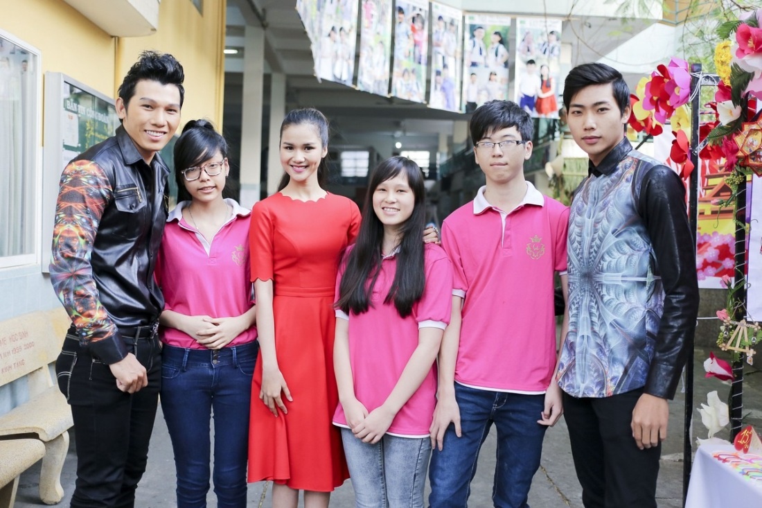 | Ngọc Tình, Ngọc Oanh và Hữu Long chụp hình giao lưu cùng các bạn học sinh trường Thái Bình. |