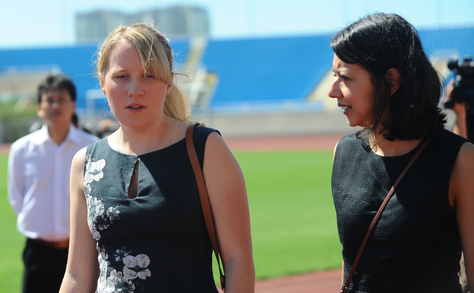 | Bethan Power (trái) - thành viên Tư vấn pháp lý và Lucia Sanchez - Giám đốc tổ chức các trận du đấu của Man City tới thăm mặt cỏ sân Mỹ Đình vào sáng 26/6. |
