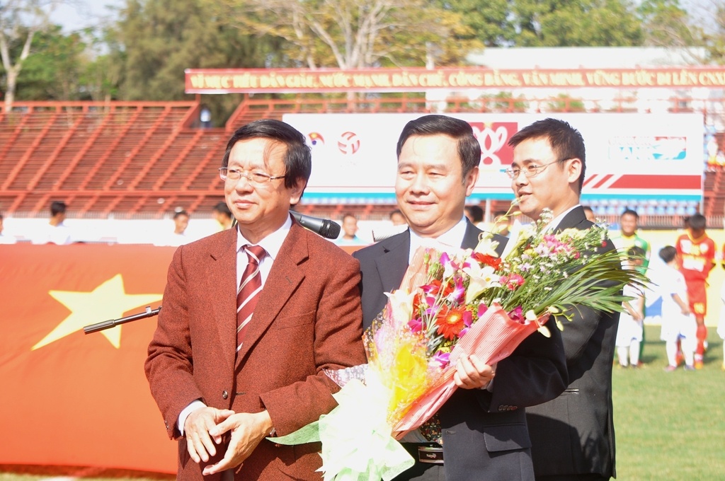| Đại diện Kienlongbank nhận hoa từ ông Phạm Ngọc Viễn (trái) - Tổng giám đốc VPF. Năm nay Kienlongbank tài trợ cả Cup quốc gia lẫn giải hạng Nhất. |