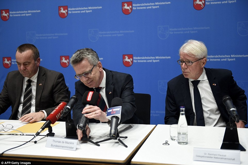 | Bộ trưởng Nội vụ Đức Thomas de Maiziere (giữa) và đại diện cho đội tuyển bóng đá Đức Reinhard Rauball (phải) xác nhận có mối đe dọa khủng bố trong cuộc họp báo. |