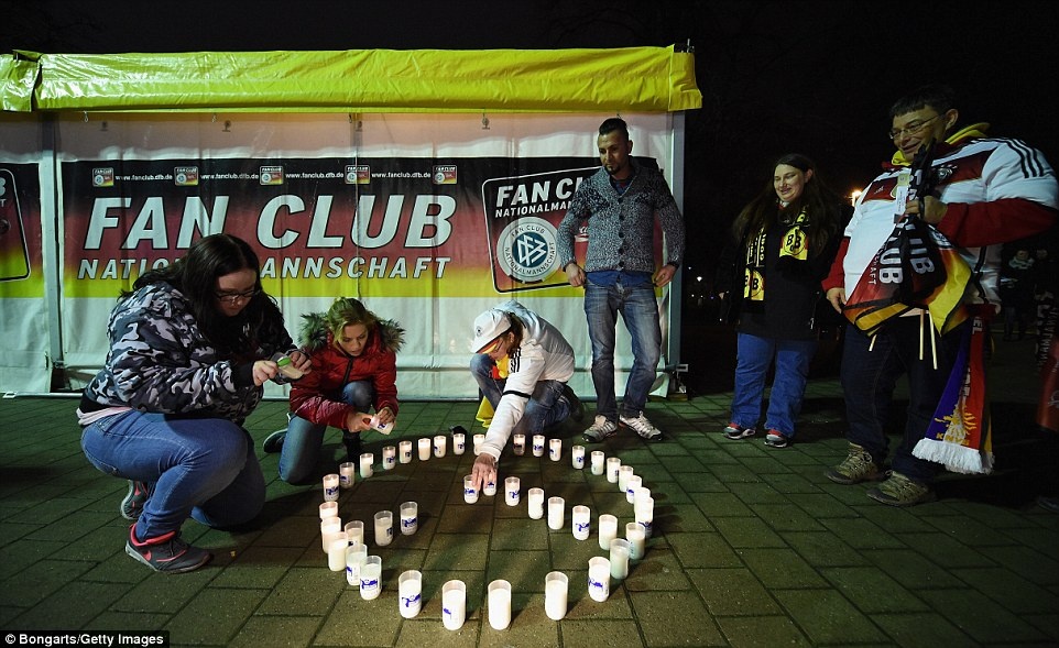 | Người hâm mộ Đức thắp nến để tưởng nhớ những nạn nhân tại Paris trước khi có lệnh sơ tán vì khủng bố. |