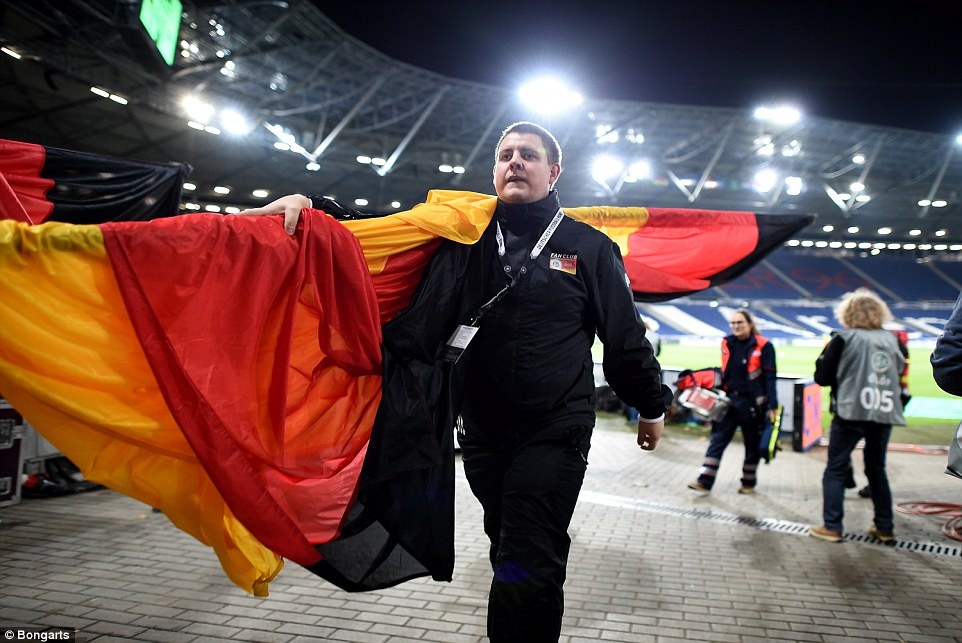 | Nhân viên sân HDI-Arena thu dọn đồ đạc chuẩn bị cho trận đấu. Trước đó, trận giao hữu giữa Bỉ và Tây Ban Nha cũng bị hủy bỏ vì lý do tương tự. |