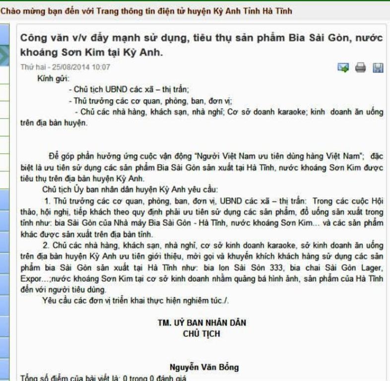 Vào tháng 8/2014, chính quyền huyện Kỳ Anh cũng từng đưa ra văn bản đăng trên trang thông tin điện tử huyện này với nội dung tương tự "Đẩy mạnh sử dụng, tiêu thụ sản phẩm Bia Sài Gòn, nước khoáng Sơn Kim tại Kỳ Anh” gửi tới các cơ quan, phòng ban, đơn vị và các chủ cửa hàng kinh doanh nhà hàng, khách sạn, karaoke trên toàn huyện do đích thân Chủ tịch huyện Kỳ Anh Nguyễn Văn Bổng ký.