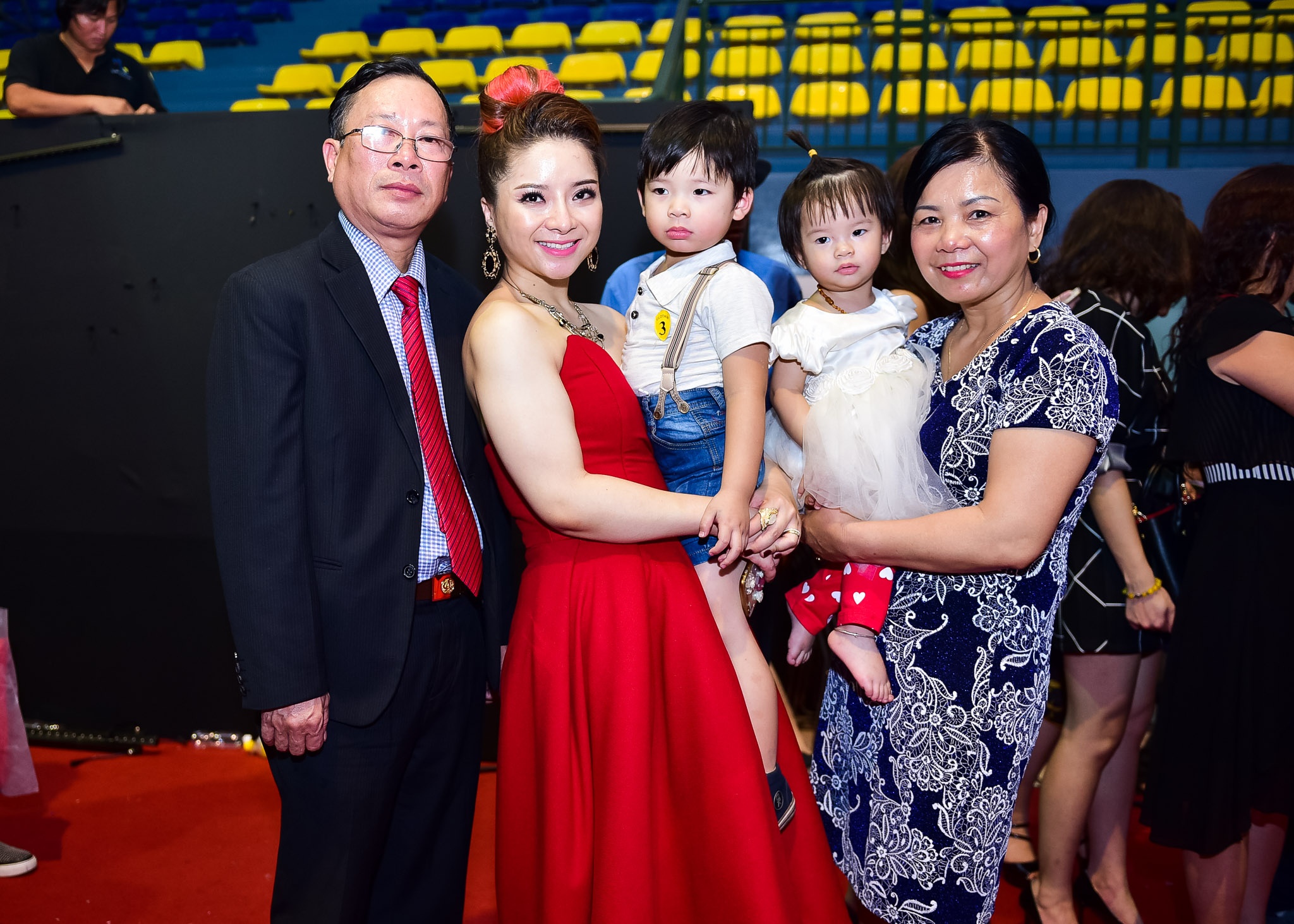 Bố mẹ ruột của Huyền Thanh đưa 2 cháu vào TP HCM cổ vũ cho mẹ. Cô con gái còn nhỏ tuổi nên không nhận ra mẹ, chỉ theo bám bà ngoại. |
