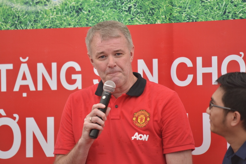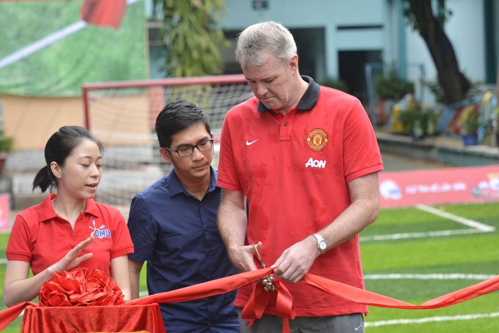 | Cùng với đối tác tài trợ của M.U là Unilever, quỹ Unilever Việt Nam, nhãn hàng Omo cùng hệ thống siêu thị Co.op, sáng nay Pallister đã đến trường phổ thông đặc biệt Nguyễn Đình Chiểu để trao tặng 1 sân bóng cỏ nhân tạo cho trẻ em khiếm thị nơi đây. Ông không giấu được sự xúc động khi thấy những trẻ em có hoàn cảnh không may mắn nơi đây. |