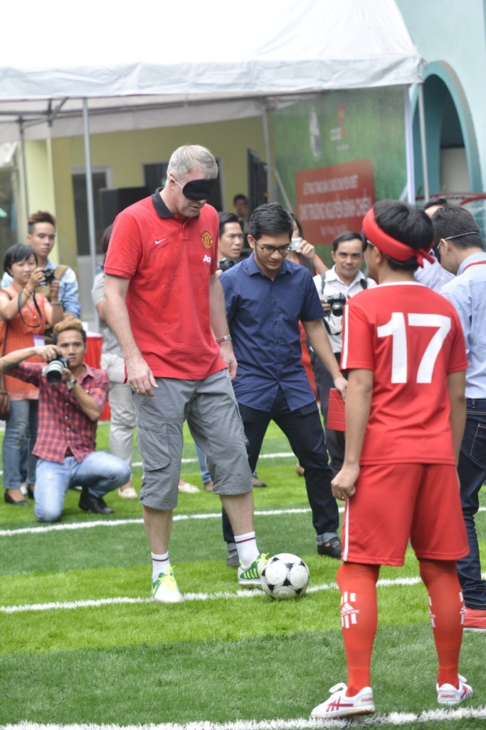 | Gary Pallister hào hứng bịt mắt để chơi bóng cùng các cầu thủ khiếm thị. Trường Nguyễn Đình Chiểu vốn có phong trào thể thao rất mạnh tại những giải dành cho người khuyết tật. |