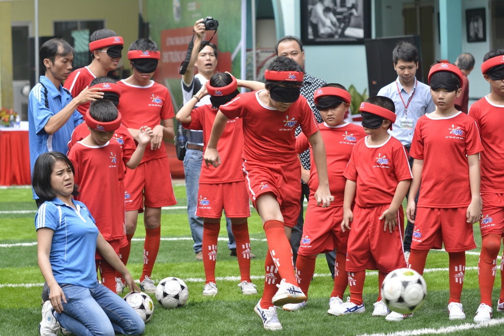 | Ngoài sân bóng, các trường cũng nhận được 40 bộ đồng phục, 40 bộ đồ bảo hộ và 20 quả bóng đặc biệt có thể phát ra âm thanh khi di chuyển giúp các em định hướng khi đá bóng. Nhận được những món quà đặc biệt này, những em thiếu may mắn của trường Nguyễn Đình Chiểu rất vui mừng. |
