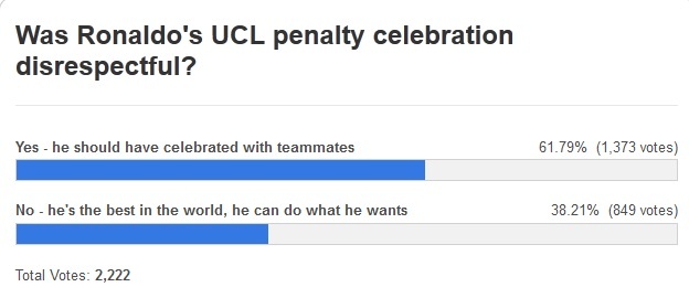 | Trả lời câu hỏi "Màn ăn mừng của Ronaldo là không tôn trọng đồng đội?", 61,79% người hâm mộ cho rằng "Đúng vậy - Ronaldo nên chia vui cùng đồng đội". Số còn lại cho rằng CR7 là cầu thủ hay nhất thế giới, có thể làm mọi việc mình thích. |