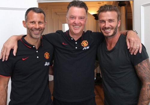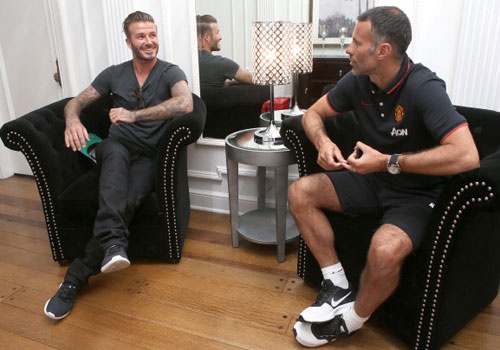 David Beckham có buổi nói chuyện với Ryan Giggs, hiện giữ vai trò trợ lý cho HLV Van Gaal ở M.U. Đây là hai thành viên trong thế hệ vàng 92 của Quỷ đỏ, từng cùng nhau giúp CLB chủ sân Old Trafford đoạt khá nhiều danh hiệu.