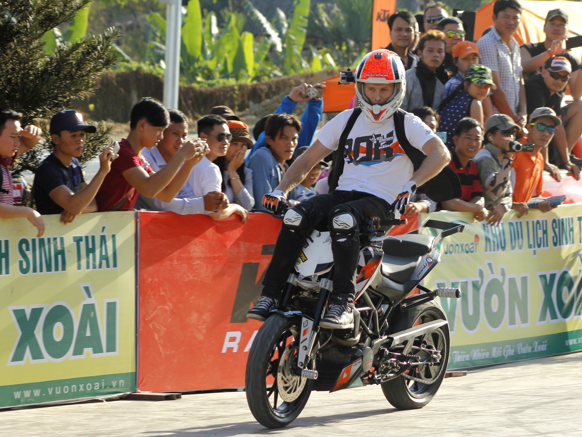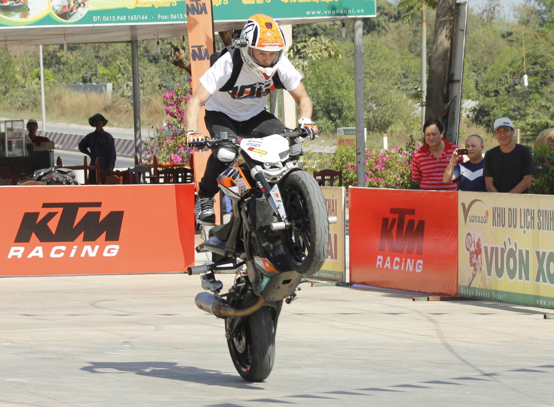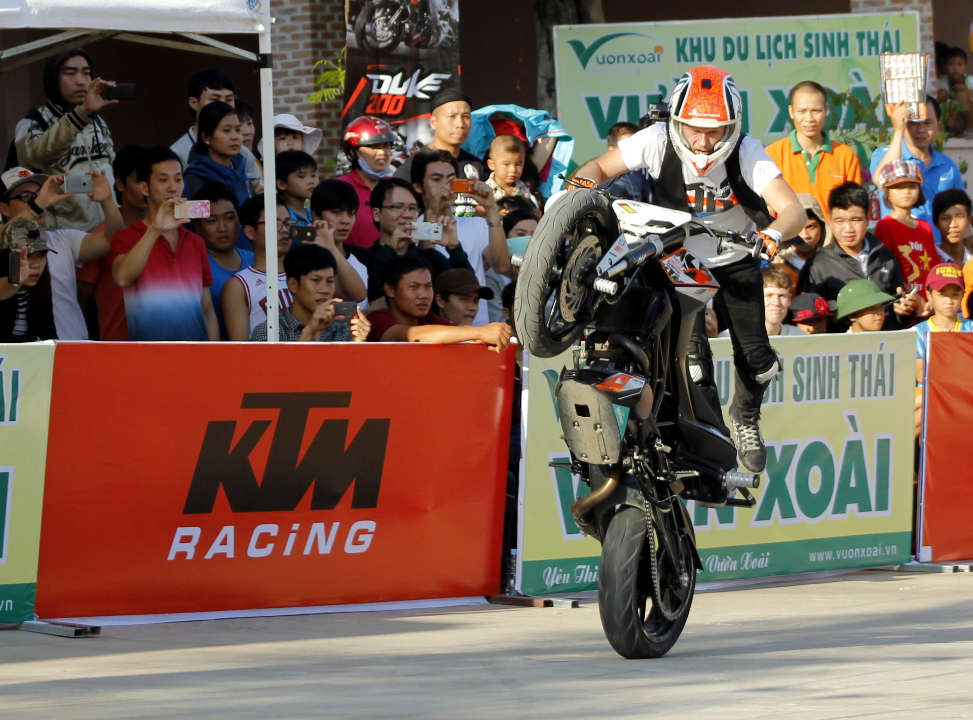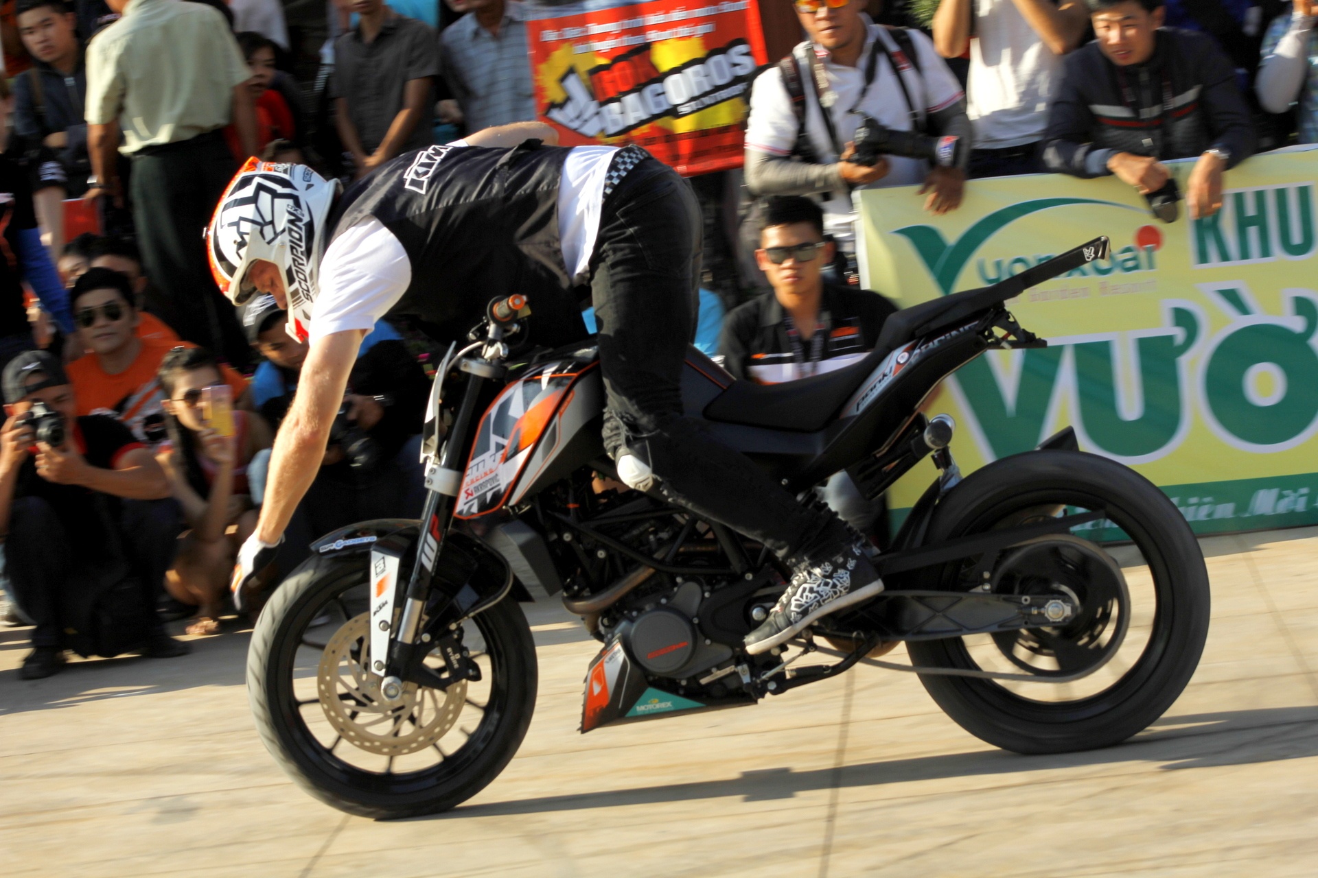 | Chiều 1/2, nhân dịp khai trương một showroom KTM tại khu vực Đồng Nai, KTM Việt Nam đã mời chuyên gia biểu diễn môtô nghệ thuật nổi tiếng Rok Bagoroš về trình diễn. Chiếc xe được sử dụng là Duke 200 được độ lại một số chi tiết nhằm đảm bảo an toàn, nhưng động cơ vẫn được giữ nguyên bản. |