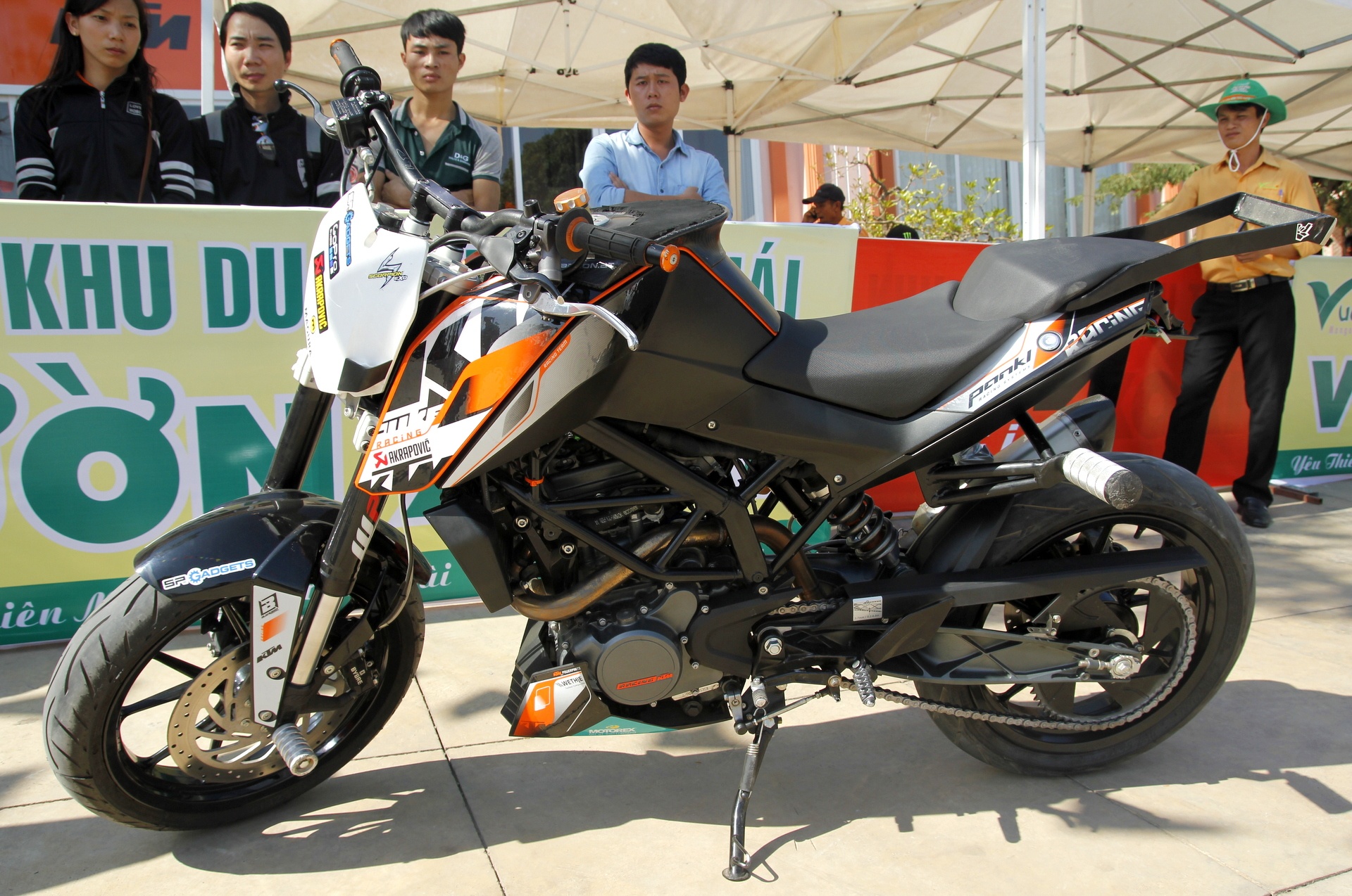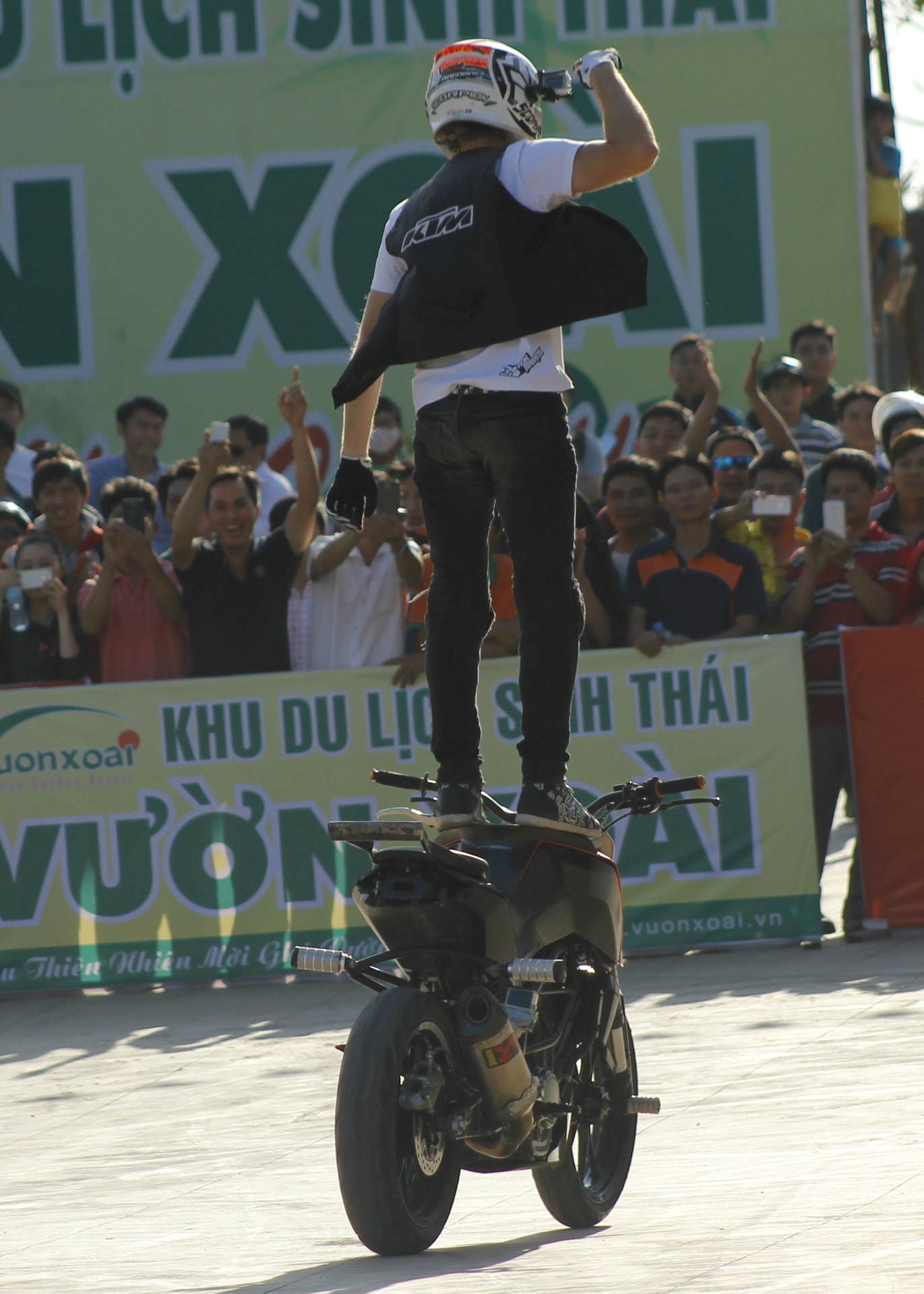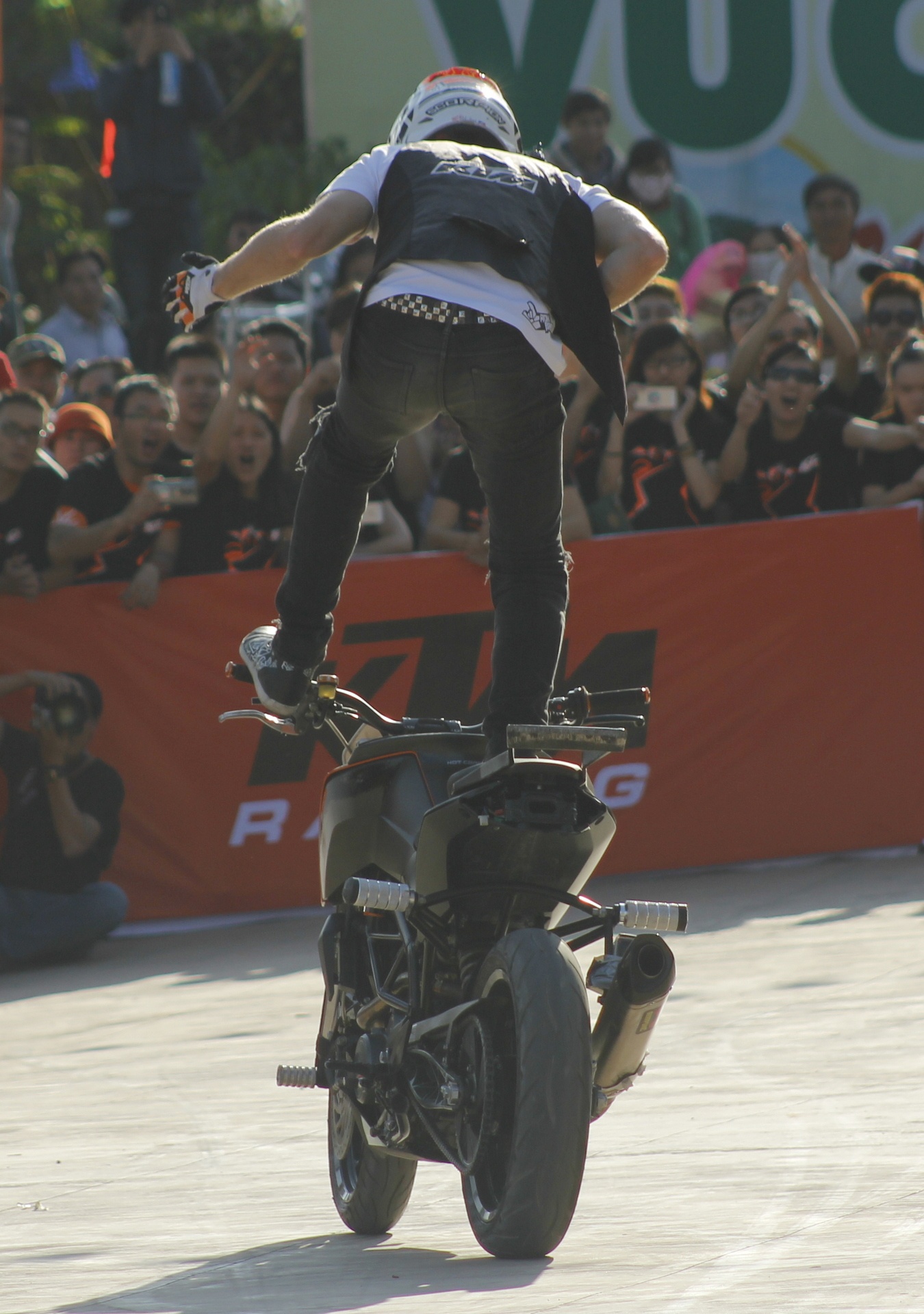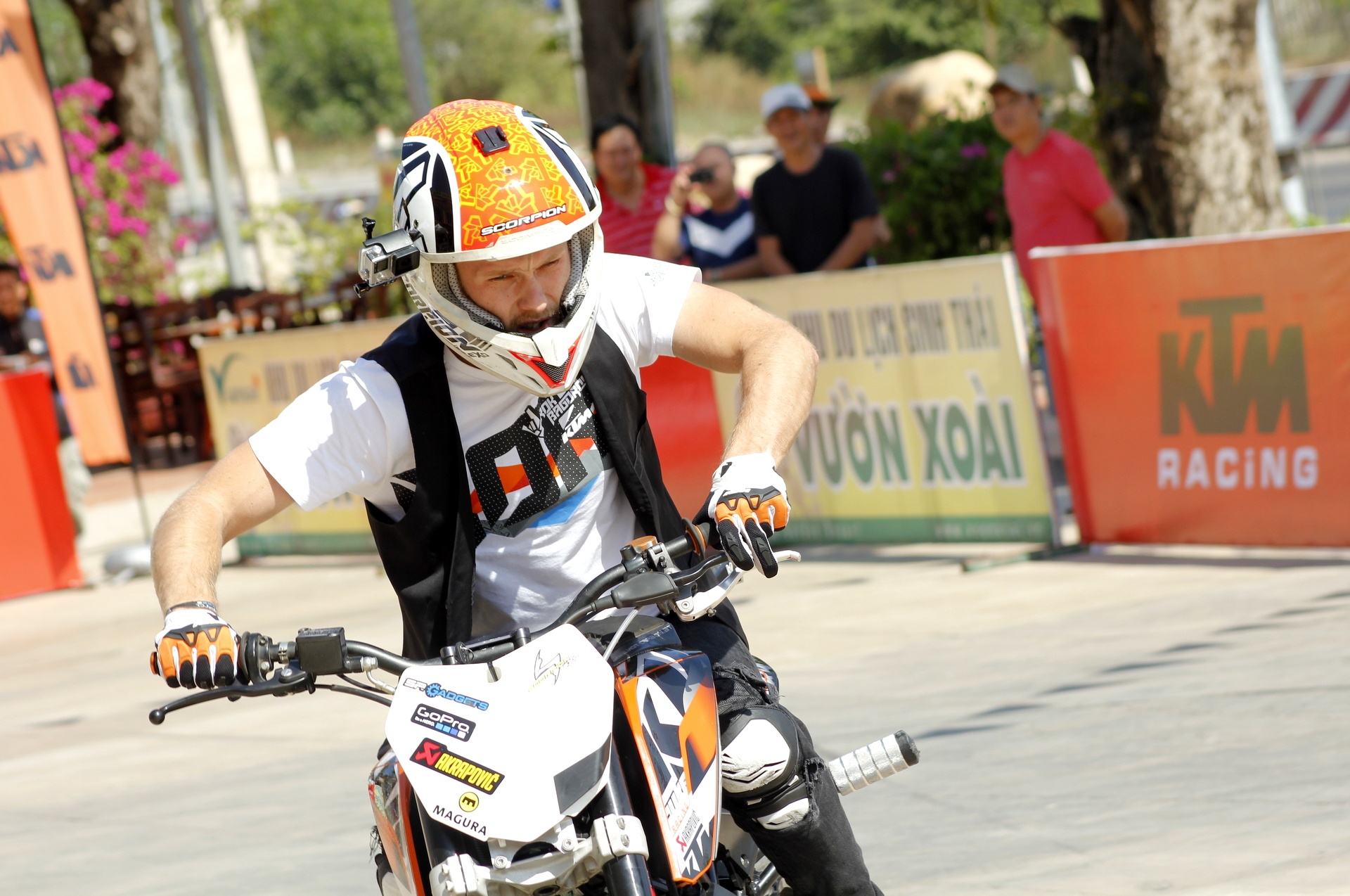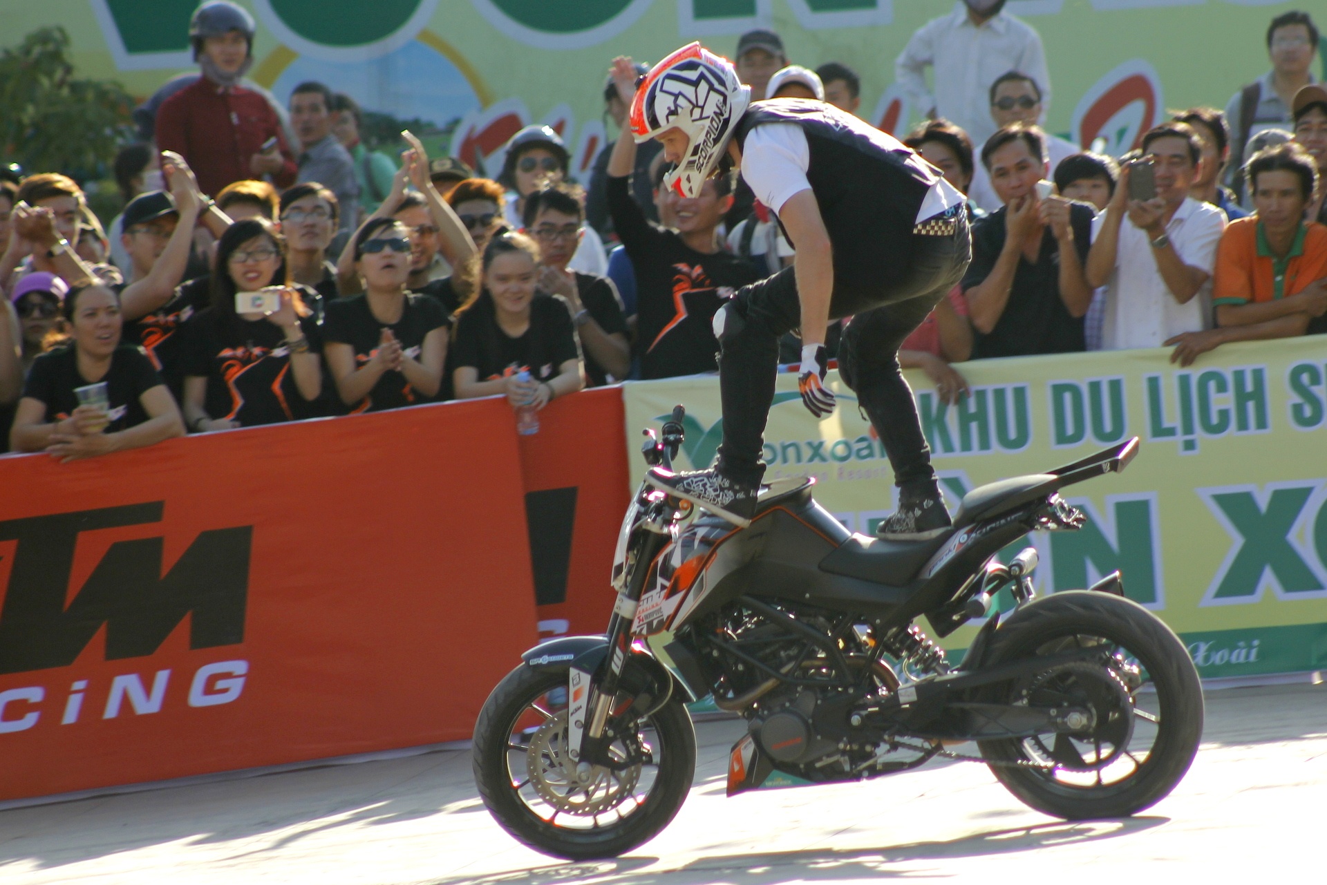 | Chiều 1/2, nhân dịp khai trương một showroom KTM tại khu vực Đồng Nai, KTM Việt Nam đã mời chuyên gia biểu diễn môtô nghệ thuật nổi tiếng Rok Bagoroš về trình diễn. Chiếc xe được sử dụng là Duke 200 được độ lại một số chi tiết nhằm đảm bảo an toàn, nhưng động cơ vẫn được giữ nguyên bản. |