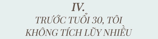 - Trước tuổi 30, tôi không tích lũy nhiều, chỉ tích lũy đủ cho công việc đầu tư. Tôi không tích lũy tài sản, nhà thì chỉ có căn nhà cha mẹ đang ở, xe cũng mua rồi bán. Tôi coi tài sản của mình là một dòng tiền.