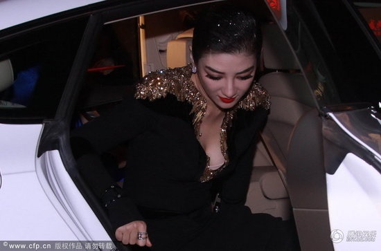 | Huỳnh Dịch trang điểm trên xe và cúi thấp hơi lộ một phần nội y. |