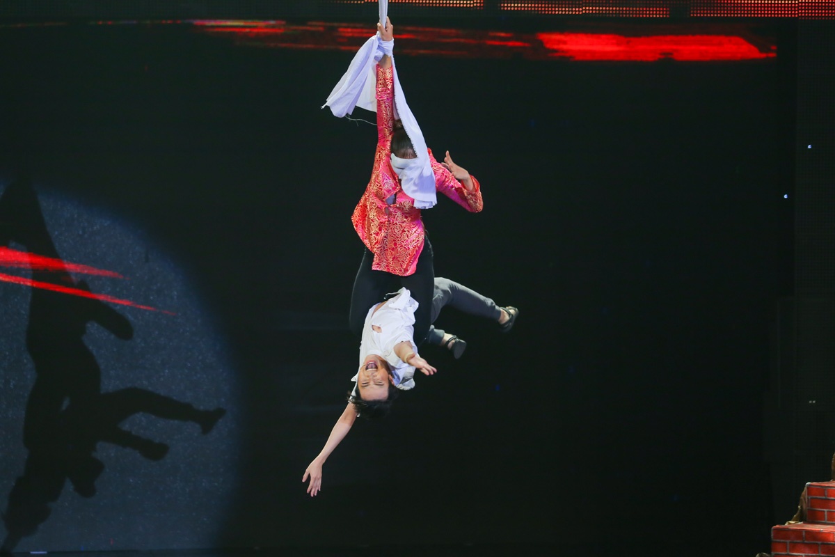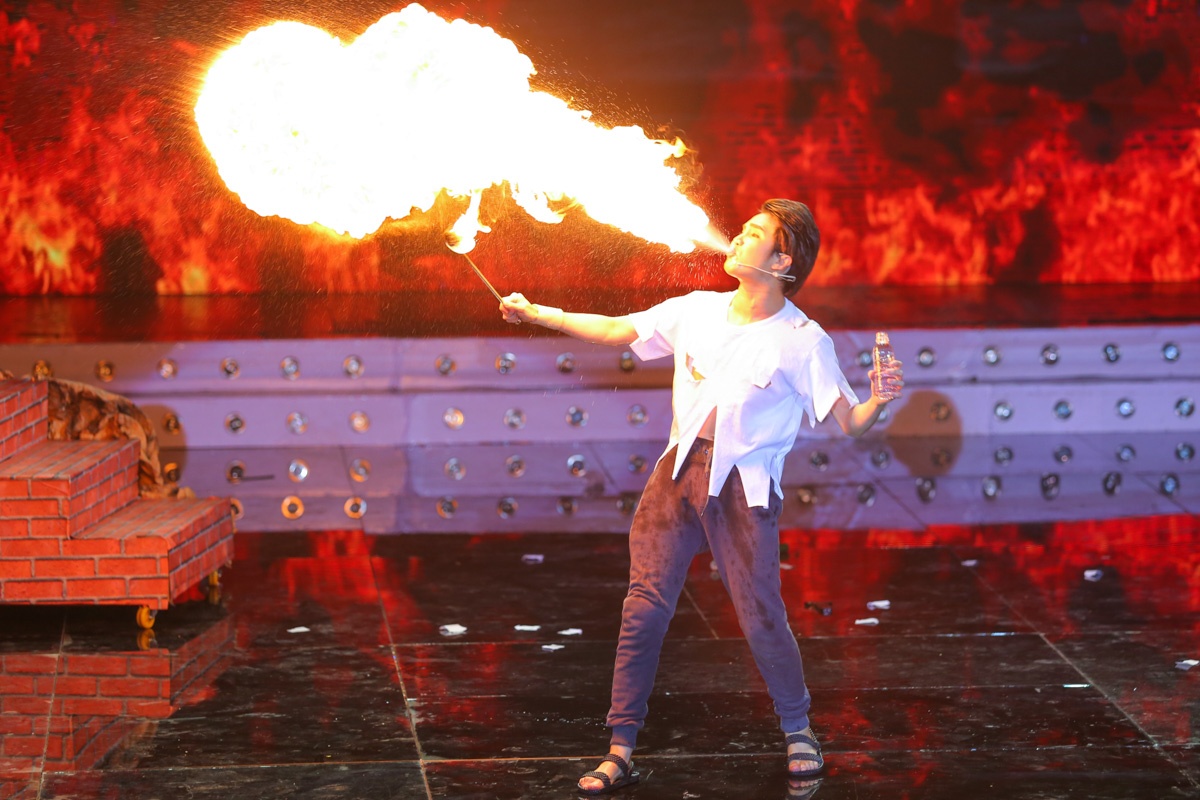 | Diễn viên gốc An Giang không những thổi lửa mà còn thực hiện cả những động tác đu dây mạo hiểm. |