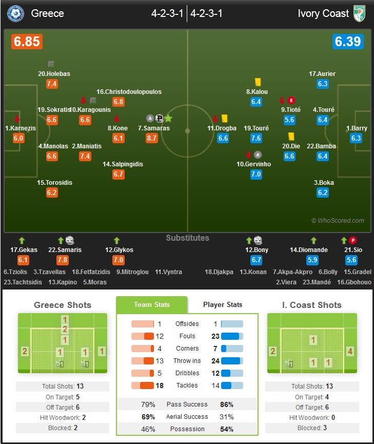 Về phần mình, Hy Lạp buộc phải từ bỏ lối chơi phòng ngự sở trường để tràn lên tìm kiếm bàn thắng nhằm thắp lên hy vọng đi tiếp. Lối chơi chủ động của các học trò HLV Santos khiến Bờ Biển Ngà gặp rất nhiều khó khăn. Khi cơ hội mở ra, đội bóng đến từ xứ sở của các vị thần đã tận dụng rất tốt để ghi bàn.