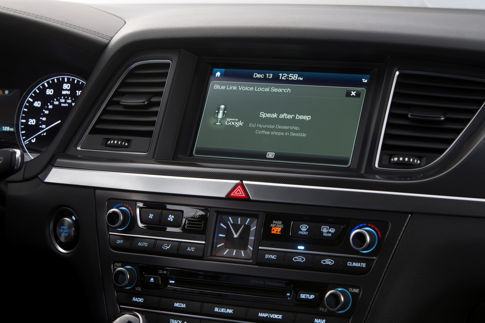 | Genesis sedan được trang bị những công nghệ tiên tiến của Hyundai, như trang bị cảm biến kiểm soát CO2 trong cabin, kết nối với kính thông minh Google Glass, công nghệ không dây Blue Link… |