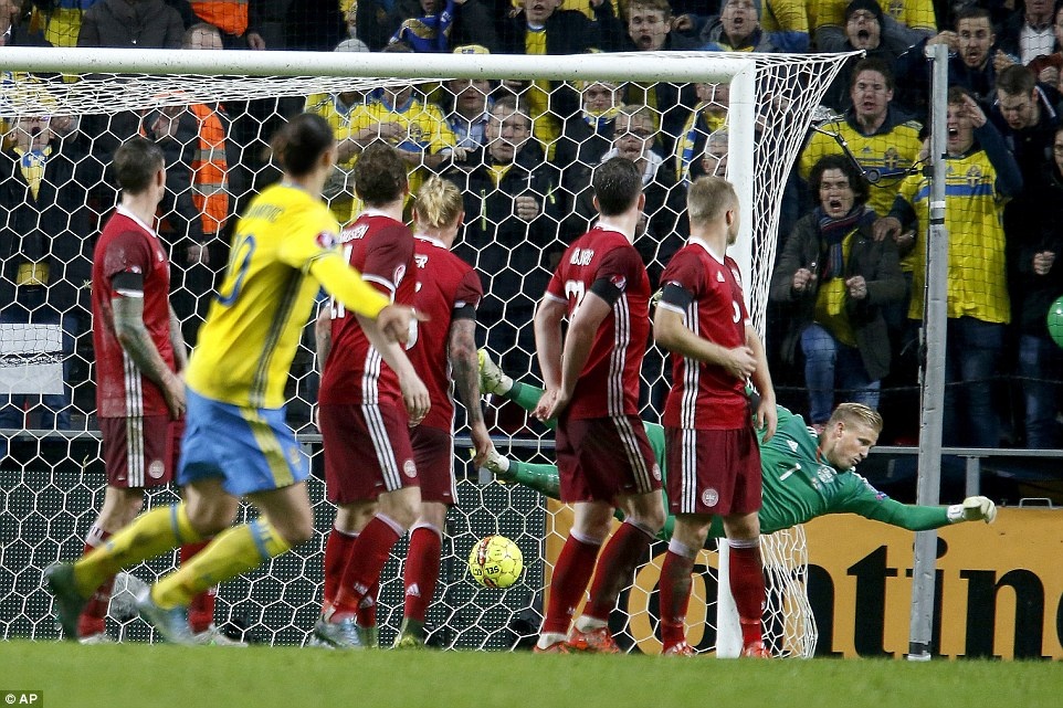 Cú sút của Ibra đưa bóng đi vào góc hiểm khiến thủ thành Kasper Schmeichel không có cơ hội cản phá.