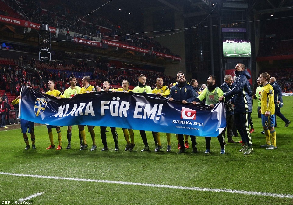 Các cầu thủ Thụy Điển cảm ơn người hâm mộ sau khi đoạt vé dự lễ hội bóng đá lớn nhất châu Âu diễn ra tại Pháp vào hè năm tới.