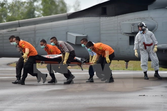 | Lực lượng tìm kiếm cứu hộ Indonesia chuyển thi thể nạn nhân QZ8501 từ máy bay trực thăng Seahawk của hải quân Mỹ tại Pangkalan Bun, tỉnh Trung Kalimantan, ngày 4/1/2015. Ảnh: AFP/TTXVN |
