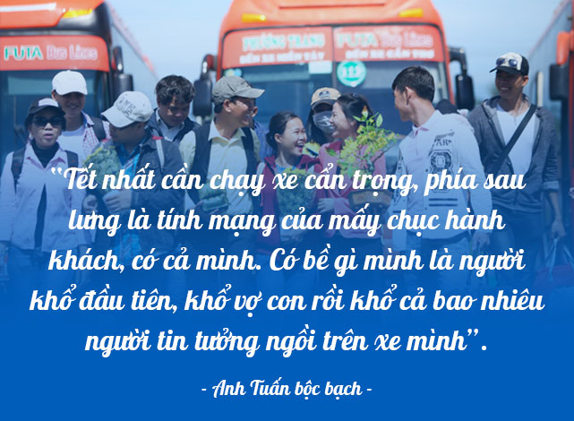 Bận bịu ngày Tết trên hành trình đưa người về quê sum họp, anh Tuấn càng cẩn trọng với từng cú nhấn ga, đánh lái. Nghề tài xế đòi hỏi anh luôn phải tập trung cao độ. Càng vào Tết đường càng đông đúc, xe cộ chen nhau, khổ nhất là dịp Tết “có những người say rượu cầm lái, họ cứ nhầm xe lớn mà đâm vào”.