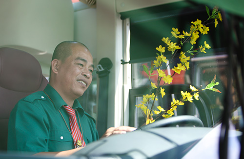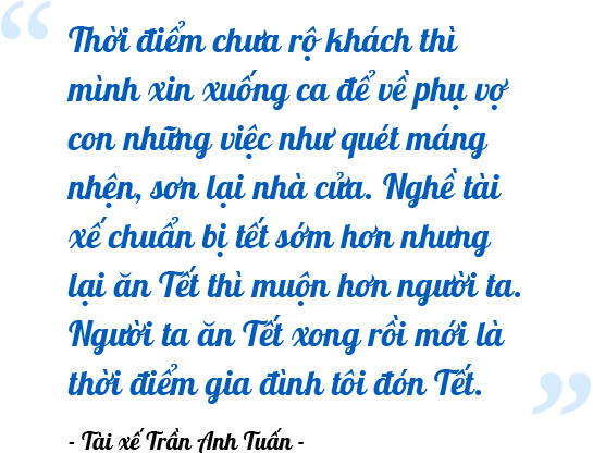 Người ta thường đùa, nghề tài xế như anh Tuấn "ôm vô-lăng" nhiều còn hơn ôm vợ con. Anh Tuấn nghe thế bật cười bảo mình chọn cái nghề thì chịu, thiệt thòi là điều đương nhiên. Thời gian đầu lái xe, anh cũng thấy buồn vì dịp Tết người ta về đón năm mới với gia đình, còn mình cứ băng băng một mình trên những chuyến xe. Dần dần, anh Tuấn tìm vui từ chính những chuyến xe mà anh lái.