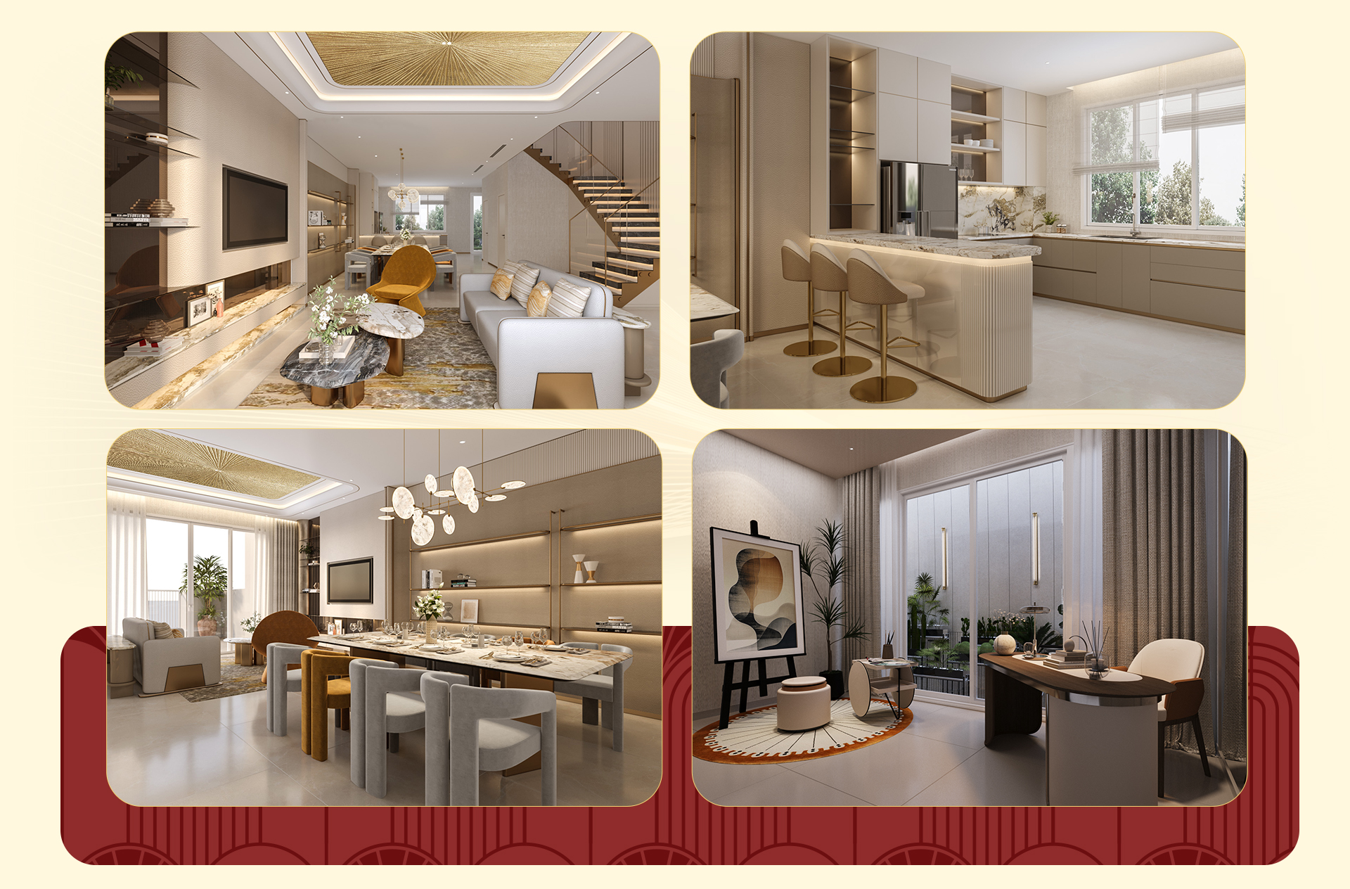 Bước vào bên trong, thế giới riêng tư mở ra, nơi ngôn ngữ thiết kế Art-Deco được tiết chế để phục vụ mọi nhu cầu đời sống. Không gian rõ ràng về hình khối nhưng mềm mại trong cảm xúc, hài hòa giữa đường nét thẳng gọn gàng và đường cong tinh tế, hướng đến sự dễ ở, dễ cảm nhận và khả năng thích nghi bền bỉ theo thời gian, thay vì phô diễn hình thức.