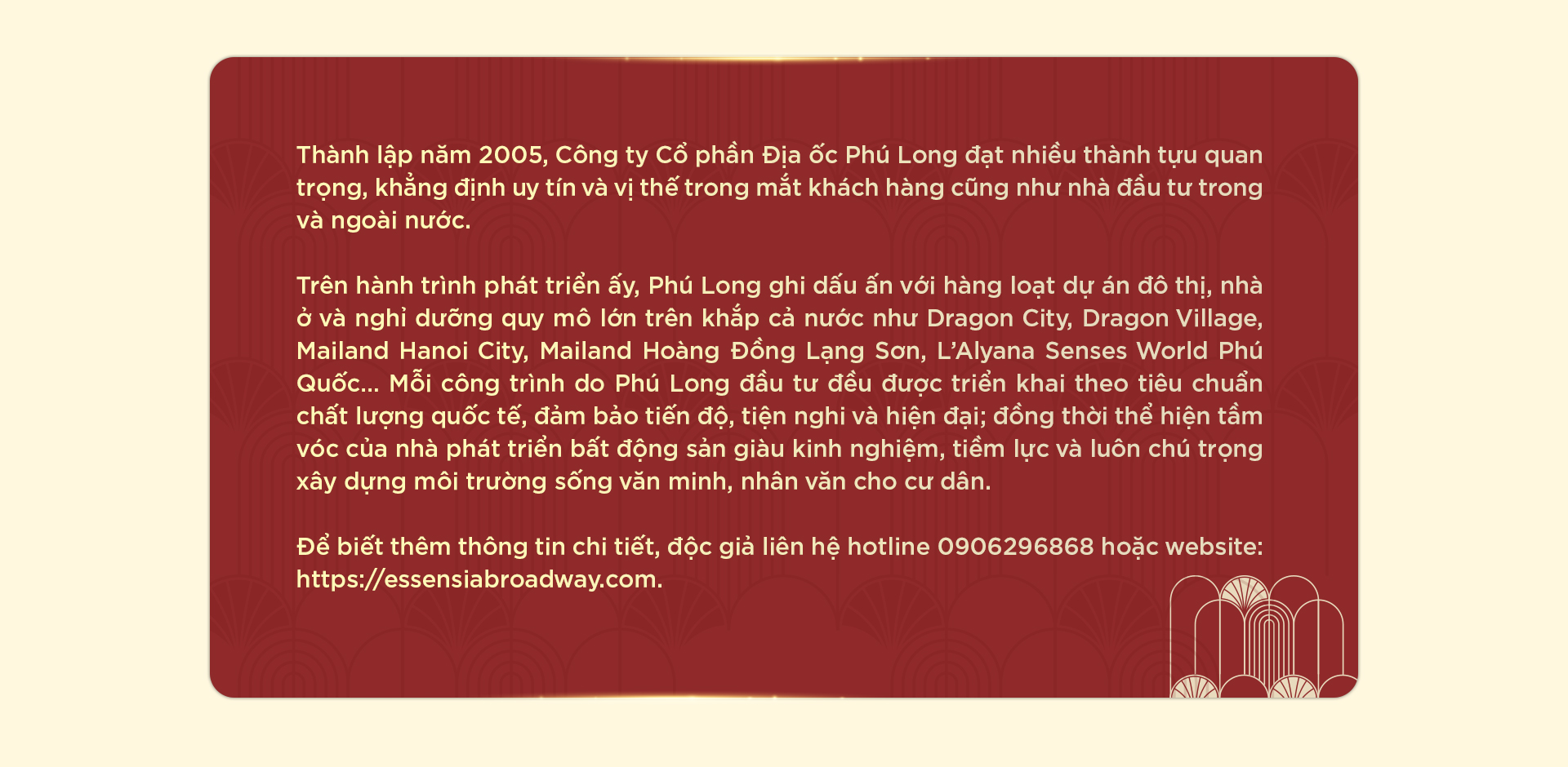 Mang tinh thần phồn hoa của sân khấu nhạc kịch Broadway về nam TP.HCM, Essensia Broadway được nhà phát triển Phú Long kiến tạo như không gian sống đậm chất nghệ thuật, nơi mỗi “mảnh ghép” đảm nhận một “vai diễn” riêng. Nhà phố thương mại gợi mở sự sầm uất với cảm hứng The Great Gatsby. Nhà phố liền kề được “chấp bút” theo ý tưởng The Rewritten House - giữ vai trò điều tiết nhịp sống gia đình trong tổng thể Art-Urban. Trong khi đó, kiến trúc Broadway Clubhouse mang hơi thở của những câu chuyện cổ “Nghìn lẻ một đêm”, trở thành điểm hội tụ năng lượng cộng đồng.