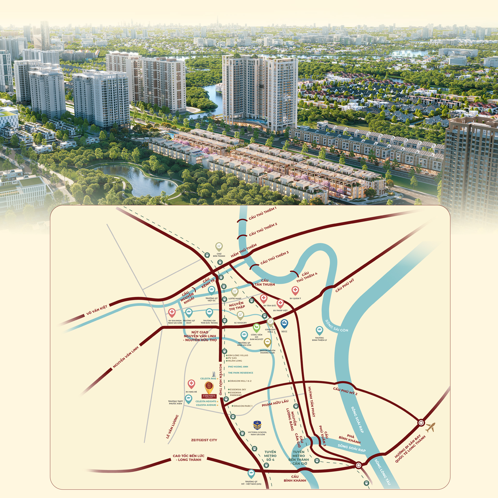 Nhờ đó, dự án trở thành giao điểm của chuẩn mực sống hiện đại, đồng thời kết nối dễ dàng với hệ tiện ích ngoại khu đã định hình của khu nam như hệ thống trường quốc tế từ mầm non đến đại học (SSIS, BVIS, KinderWorld, Victoria School, RMIT); cơ sở y tế hàng đầu (FV, Tâm Đức, Tâm Anh) cùng chuỗi trung tâm thương mại lớn (SC VivoCity, Crescent Mall, Lotte Mart hay Aeon Mall).